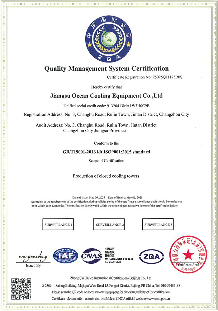 The company is mainly engaged in the research and development, design, manufacturing, and installation of various cooling towers, and can provide systematic heat exchange solutions according to user needs. At present, the company has passed multiple system certifications and holds multiple certification certificates and honor certificates.